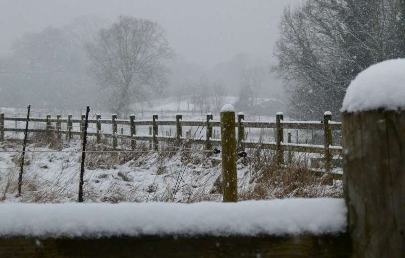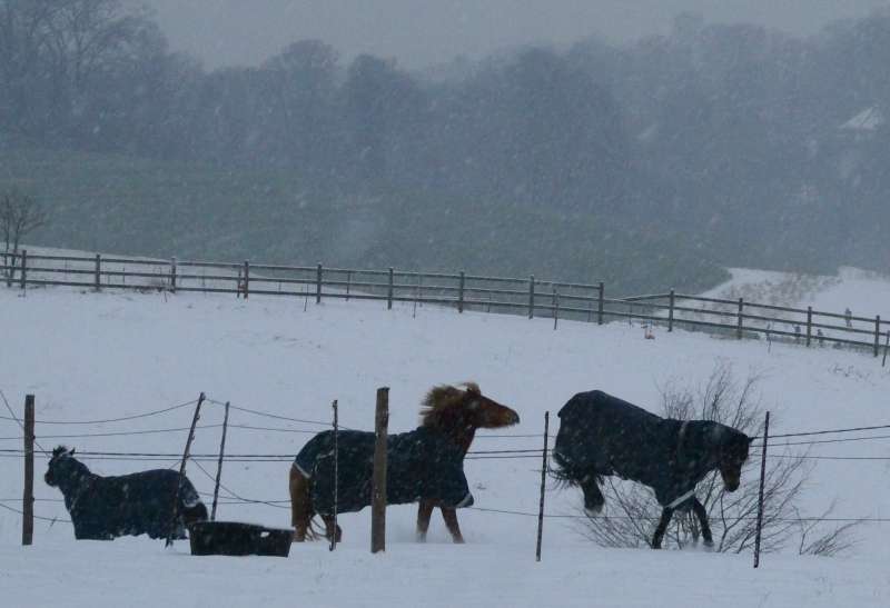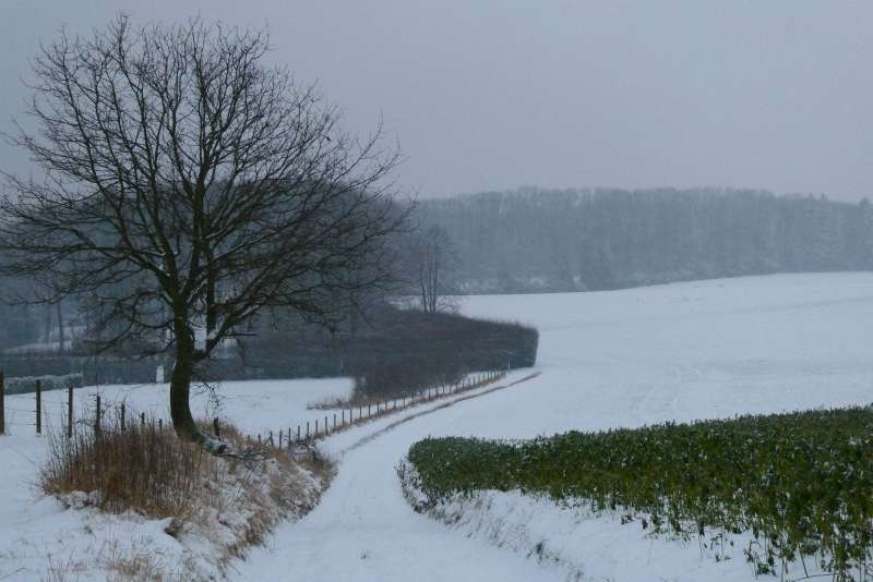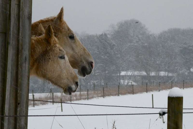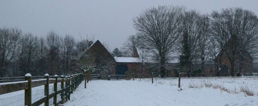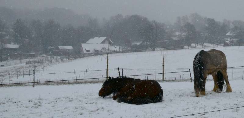 À l'horizon, les toits blanchis de neige de la ferme de Percke se confondent