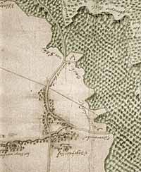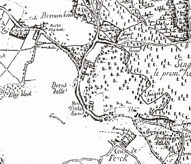 Le chemin de Rhode-St-Genèse (de "RodeStraat") qui reliait Uccle à Rhode dont elle dépendait, descend du nord au sud en formant une boucle encaissée au niveau de Verrewinkel (au centre des cartes). C'est, à cet endroit, l'actuelle avenue Dolez menant à la rue de Perck. |