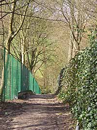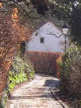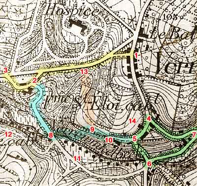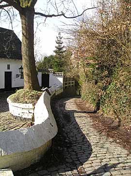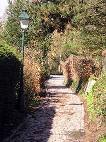 En 1937, le début du chemin fut quelque peu dévié vers l'est afin d'éviter la ferme St-Éloi (à gauche du 2). Depuis, le chemin passe le long du bois de Buysdelle, là où le chemin est étroit et mal formé, avec heureusement un escalier depuis 2005. Complétons le tableau par deux chemins sortant de la commune d'Uccle puisqu'à Linkebeek : - Le chemin de Kleindal (en 11 et 6) qui permet de rejoindre la rue de Perck (notez que le côté supérieur du triangle en 11 a aujourd'hui disparu, notez aussi la petite erreur dans la représentation des courbes de niveau sur la carte entre 11 et 6 puisque le chemin y est quasiment plat...). - Et le chemin en 12 qui filait le long du Verrewinkelbeek vers le Moulin Rose (en dehors de la carte). Ce moulin qui devint une auberge en 1920 servait de la gueuze et de la kriek. Il devait être agréable de s'y attabler les dimanches d'été, au bord de son étang (à sec aujourd'hui), après avoir joué une partie de golf miniature (dont des traces restent visibles dans les mauvaises herbes en amont de l'étang...). Le chemin en 12 existe toujours mais il traverse des prairies fermées par des barbelés électrifiés. Des pancartes en interdisent l'accès aux promeneurs... |