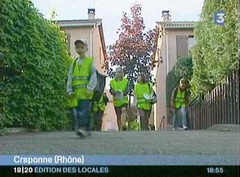Ne pourrait-on pas leur proposer le "Pédibus" ? À Craponne, dans le Rhône, on utilise ce moyen de transport rapide et plus sûr (dixit l'édition des Locales de France 3, le 15 mai 2006). Chaque jour des parents bénévoles accompagnent à pied les enfants jusqu'à leur école pour réduire le nombre de voitures devant les établissements scolaires. Une mère de famille : Un enfant : La voix de la sagesse ! |